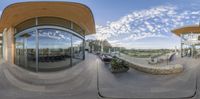 a fish eye view of the outside of a building and a building in the distance
