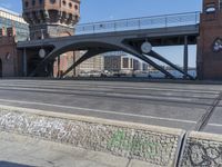 This stock photo showcases the vibrant city of Berlin in Germany. The architecture includes tall buildings with windows, lined roads made of asphalt, and a composite material bridge. The image was taken during the day with clear skies and clouds in the background. A bridge, specifically a tied-arch bridge made of concrete, serves as an important infrastructure for vehicles and pedestrians. The urban design includes vegetation, a fence, a curb, and street lights along the thoroughfare. This photo represents the classic architecture and metropolitan area of Berlin, a city in Europe.
