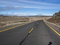 A view from the road, looking straight ahead. Open space and vegetation line the sides. Clouds hang overhead, casting shadows on the asphalt. A serene landscape on a quiet thoroughfare.