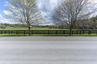 This stock photo features a scenic road surrounded by lush green trees, grass, and farmland in rural Ontario, Canada. The asphalt road surface is highlighted by the sunlight filtering through the clouds, creating a beautiful play of light and shade. A wooden split rail fence and a sturdy guard rail add a touch of rustic charm to the landscape. The image captures the serene beauty and peacefulness of the countryside in Ontario, with the city of Toronto in the distance.