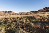 This is a photo of a scenic landscape in Utah, USA. The image captures a dirt road winding through the desert, surrounded by red rock mountains and rugged terrain. The clear sky above highlights the natural beauty of the canyonlands and the unique geological formations. The sand street adds to the wild and untouched feel of this remote wilderness. With its stunning profile and diverse vegetation, this area showcases the beauty of Utah's mountain landforms. The image represents the natural environment and the sense of adventure that can be found in the Needles district of Canyonlands National Park.