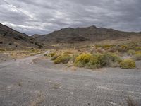 An endless road winds through the rugged wilderness of Utah's desert. Surrounded by mountains, the landscape is a mix of rocky landforms, dry vegetation, and gravel paths. A grey sky adds to the natural beauty of this remote area.
