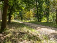 This image captures a rugged landscape in Berlin, Germany. An empty dirt road stretches through the forest, surrounded by grass and fallen leaves. The natural setting gives a sense of tranquility and connection to nature. The road, made of gravel, invites adventurers to explore the off-road track. It is a perfect scene for those seeking an escape from the bustling city life. In this serene day setting, the road blends harmoniously with the surrounding nature, offering a peaceful and picturesque view of Berlin's wilderness.