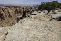 Rugged red rock landscape in Moab, Utah. Steep cliff formations and canyons create a stunning open space. A single tree stands tall amidst the rocky terrain. Off-road tracks lead you through this desert wonderland.