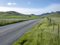 Elevated road in rural California, surrounded by lush green vegetation. The highland landscape with a mix of hills, pastures, and plains creates a picturesque view. The cloudy sky adds drama to the natural environment.