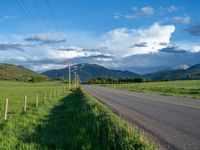 a lone country road is in the countryside area with mountains on both sides and barbed fence between the two sides