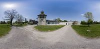 A classic architecture manor house with a tower set in a picturesque grassy field. Dirt roads intersect, leading to nearby attractions in Hamilton, Ontario. A charming rural landscape with lush vegetation and historic buildings.