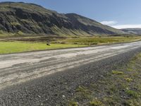 This is an image of a dirt road running down some mountains in Iceland. The landscape is characterized by vast grass plains and rocky slopes. The road surface is made of gravel, adding to the rural feel of the scene. In the distance, a mountain range can be seen against a clear sky. This photo captures the natural beauty of Iceland's highlands and showcases the unique terrain of this European island.