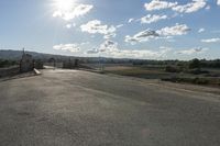 An empty country road leads the way to the hills in the distance. The sunny landscape provides a picturesque view of nature. The road's smooth asphalt surface reflects the cloud-filled sky.