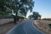 This stunning stock photo features a scenic rural landscape with lush vegetation, including trees and grass. The clear sky adds a sense of tranquility to the image. In the foreground, there is a road surface made of tar and asphalt, leading to a land lot. The photo was taken during dawn, capturing the beautiful colors of the break of day. The location appears to be a rural area, possibly a farm specializing in agriculture.