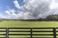 A lush pasture in rural Ontario, with two horses grazing on green grass. The view is framed by a black fence and a split rail fence. Cumulus clouds dot the blue sky, providing a picturesque backdrop.