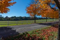 road in the fall with yellow trees near a fenced area and field behind it