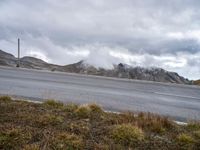 A scenic rural road in Austria winds through the majestic mountains of Europe. Clouds hover over the landscape on a cloudy day, creating a dramatic atmosphere. The road leads to a grassy area with a fire hydrant, adding a touch of local charm.
