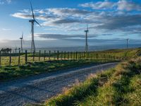 A rural road at dawn, surrounded by lush greenery and agricultural fields. Hard shadows cast by windmills on gravel and dirt streets. The break of day brings a serene atmosphere to this countryside landscape.