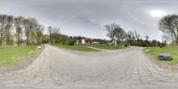 a panoramic view of a rural road surrounded by trees and lawns with homes