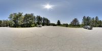 a car parked in the middle of a road surrounded by trees with a sun glaring on it