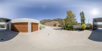 Skateboarders ride around in the parking lot of a large house with a modern architectural structure. The low-profile villa is situated in a rural area of Los Angeles, California, providing an open space for recreational activities under a clear sky.