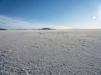the sun shining over an expanse of frozen water with tracks left in the snow and a distant mountain in the distance