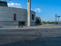 A profile view of a modern architecture wall in Salt Lake City, Utah. The concrete road leading to the city showcases the urban design. The break of day brings a beautiful dawn sky over the city.