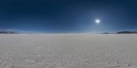 a wide shot looking down at a frozen plain under a bright sky with clouds, sun and mountains