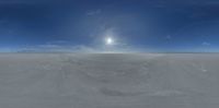 A breathtaking salt flat under a clear sky extends through an endless open space. Sunshine illuminates the landscape, crafting a desert with visible clouds and a serene skydome, capturing the essence of nature's vastness.