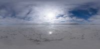 A salt lake in Utah, USA, showcasing expansive open spaces. The sun is visible in the sky, casting sunshine over the desert landscape. Mountains and clouds enhance the natural beauty of Salt Lake City.