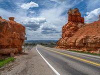 A scenic view of a road on the iconic Scenic Byway 12 in Utah, USA. Surrounded by breathtaking red rock formations and majestic mountains, this road offers a stunning landscape of nature and beauty.