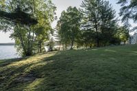 This captivating stock photo showcases a picturesque view of a serene lake surrounded by a lush forest and a vibrant green grassy area. In the foreground, a charming residential house stands amidst an open space. The natural beauty of the landscape, with its tall evergreen trees, provides a perfect backdrop for relaxation and immersion in nature. The sunlight filters through the branches, casting enchanting shadows and shades on the grass surface. This idyllic scene with a peaceful lake, towering trees, and a spacious courtyard evokes a sense of tranquility and invites you to escape into the rural beauty of Canada. Perfect for illustrating concepts related to nature, home, rural living, and open spaces.