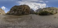 a wide angle fish - eye view of a rocky mountain side with one tree growing