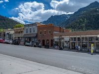 Scenic mountain road in Ouray, Colorado. Suburban village lined with storefronts and restaurants. Clear skies and clouds provide a picturesque backdrop. Perfect spot for a day of shopping and eating out.
