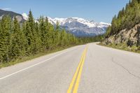 A scenic landscape of a straight road winding through the mountains of Canada. Lined with trees and surrounded by nature, the road offers stunning views of the clear sky above. This road trip in British Columbia and Alberta is a nature lover's dream.