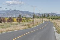 A scenic view of a road winding through the picturesque landscape of British Columbia, Canada. The road is surrounded by mountains, natural vegetation, and agricultural fields. Clear skies and a sunny day enhance the beauty of the Okanagan Valley in Kelowna.