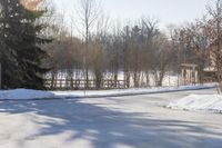 A scenic road in rural Ontario, lined with trees and covered in a layer of snow and frost. The clear winter sky and sunlight create a picturesque landscape. The residential homes and infrastructure blend seamlessly with nature.