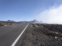 A scenic road in Tenerife, Spain cuts through a haze-covered desert landscape. The asphalt highway winds through the highlands and mountainous terrain, surrounded by clear skies. Explore the beauty of nature in Europe!