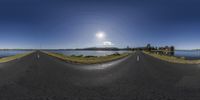 some street and a lake under the sun and a cloud filled sky that looks like some circles