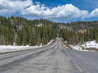 A scenic winter landscape in Colorado, USA. The road stretches ahead, surrounded by snowy peaks and a frozen lake. The clear sky and fluffy clouds add to the beauty of the natural scenery.
