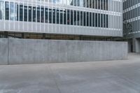 there is a concrete wall by a building with windows that are large and have been built over