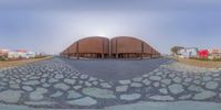 A modern architectural marvel in Shanghai, China. The massive dome-shaped building stands tall against the city skyline. Water stones add a touch of tranquility to the bustling cityscape.