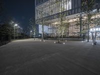 An empty courtyard in the heart of Shanghai's bustling business district, lit by the glow of street lights. A modern office building stands in the background, casting long shadows on the concrete surface. A midnight scene of urban design in China.