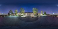 this image shows the view of an empty skateboard park from below, with a night sky and trees surrounding