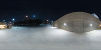 A skate park in Dallas, Texas, illuminated by artificial lights at night. The modern architecture, concrete surfaces, and glass walls create a dynamic urban landscape. Blurry image captures the fast-paced energy of the city.