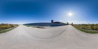a fisheye view of the sun over a half - pipe skateboard park near an area with green grass and bushes