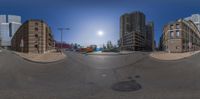 A skateboarder rides through the streets of Holland at night, passing by classic and modern architecture. City lights illuminate the urban landscape, creating a vibrant atmosphere. The skateboarder looks up at the towering buildings.