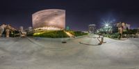 A skateboarder performing tricks on a half pipe at night, with a modern architecture building and a circular dome in the background. The cityscape reflects artificial lights against a clear sky.