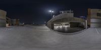 a skateboarder riding a skateboard on a ramp at night time through the back of a skate park