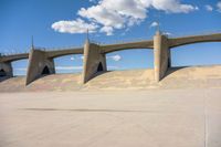 a skateboarder at the skate park in front of a bridge and stairs, against a cloudy blue sky