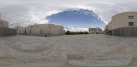 A skateboarder glides across a modern urban open space in Spain. The wide lens captures the skateboarder's profile against the backdrop of contemporary architecture. The cloud-dotted sky adds to the European charm of the scene.