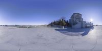 An elevated view of skateboarders at an indoor skate park in Montreal, Quebec. The clear sky provides a high view of the cityscape. The surface outside the building offers an open space for skating. A perfect day for tourists to overlook the action.