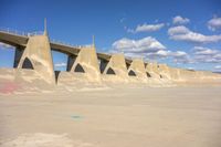 Skateboarding on a concrete bridge in Los Angeles, California. Cloudy skies create a dramatic backdrop for the urban landscape. The man smoothly glides along the pavement, enjoying a sunny day.