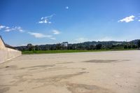 A man riding a skateboard on top of a cement ramp, surrounded by the open spaces of Los Angeles. The clear blue sky with fluffy clouds and the concrete surface provide the perfect setting for a day of skateboarding.